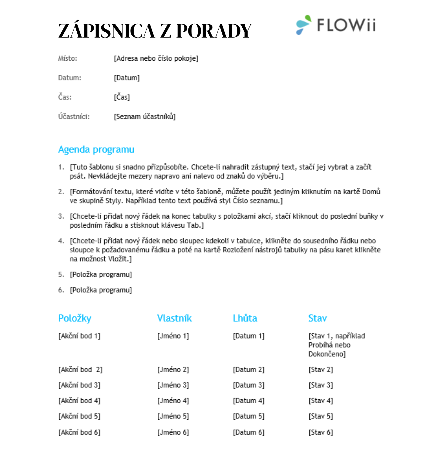 • Uveďte základné údaje – dátum, čas, miesto rokovania a mená účastníkov.