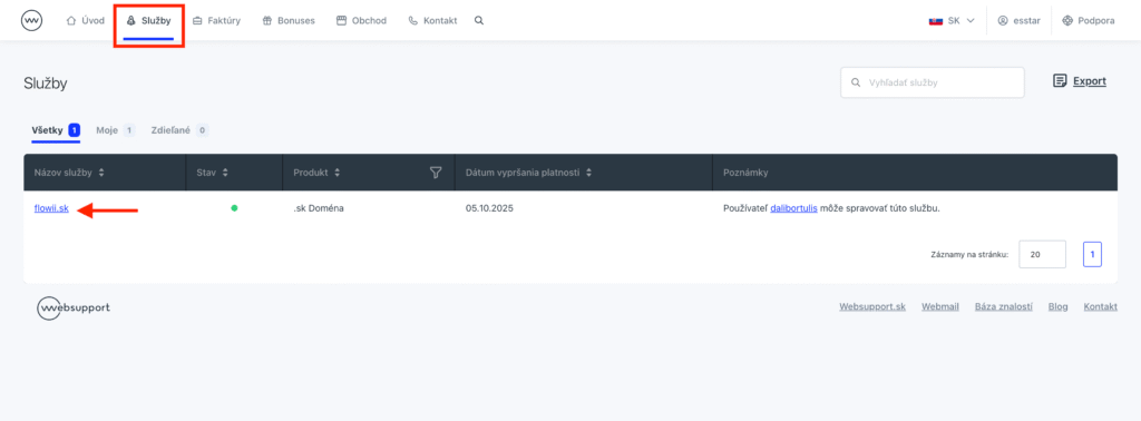 - V službách vyhľadajte vašu doménu a kliknite na ňu