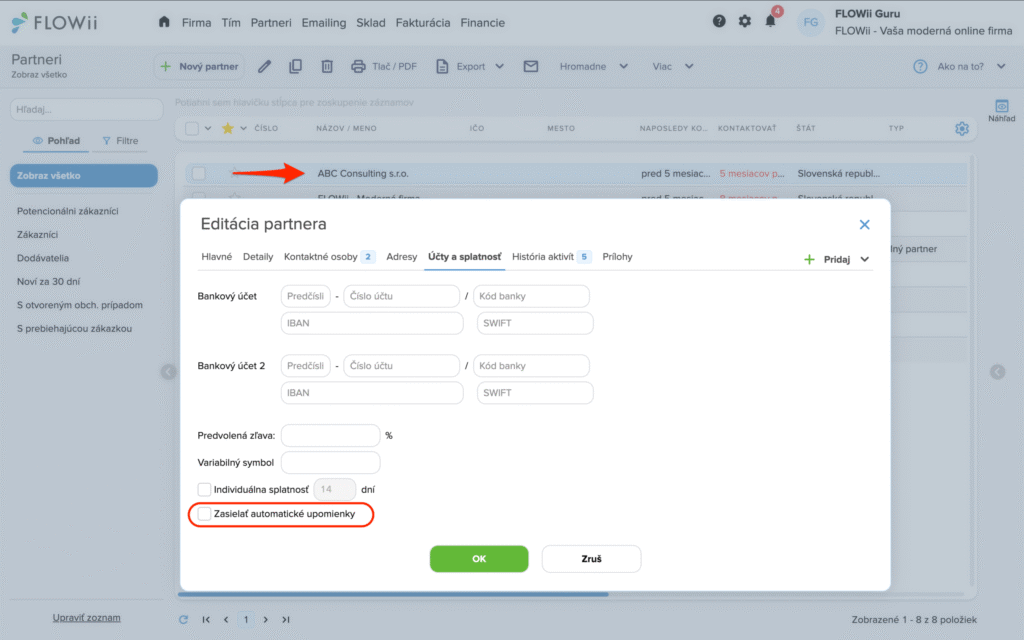 Nechcete, aby sa vybraným partnerom odosielali pripomienky a upomienky automaticky? Nastavenie nájdete priamo na karte Partnera.