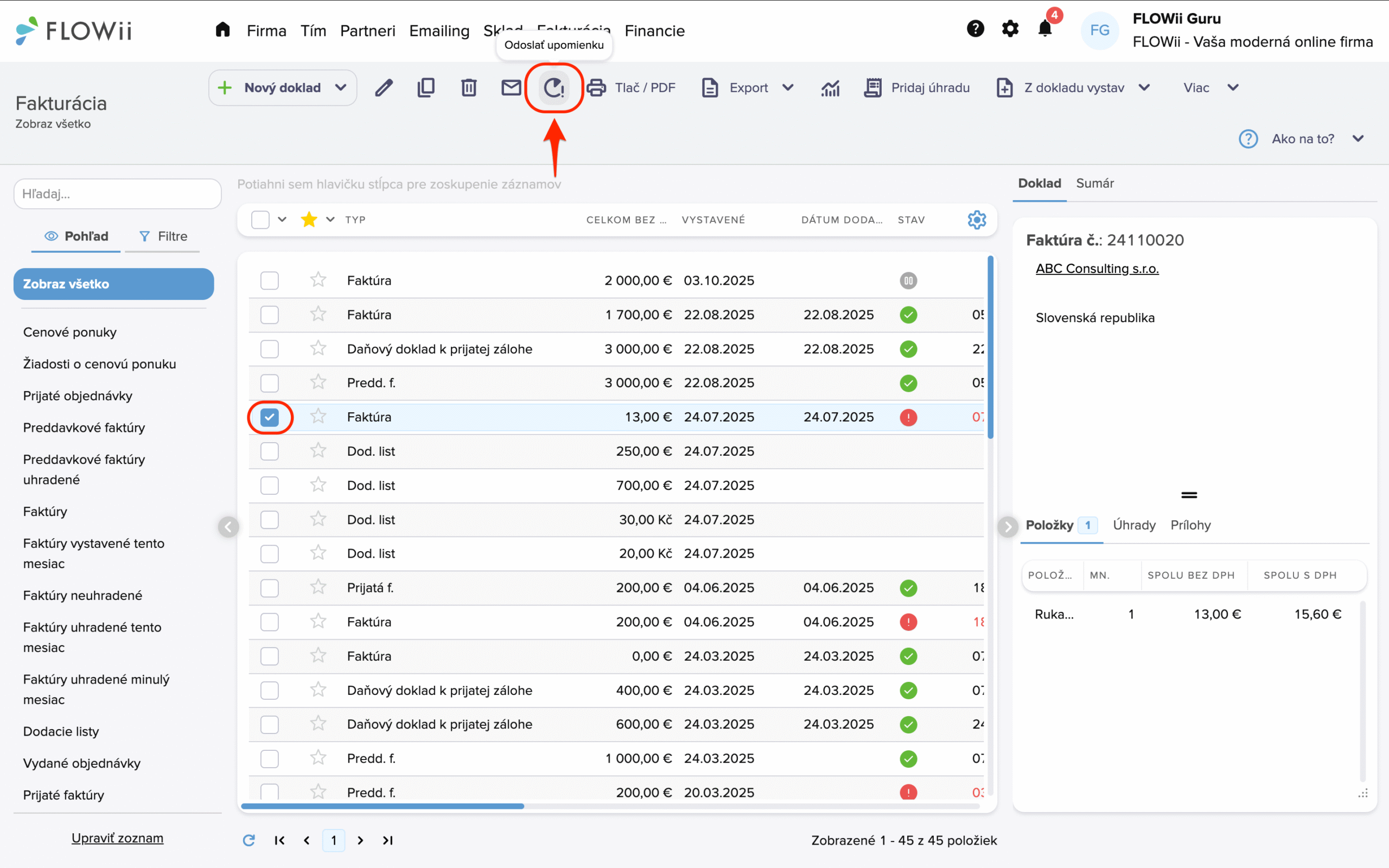 FLOWii umožňuje automaticky aj manuálne odosielať pripomienky a upomienky k faktúram. Vďaka tejto funkcii už nemusíte sledovať, komu ste poslali upozornenie – systém to spraví za vás.
