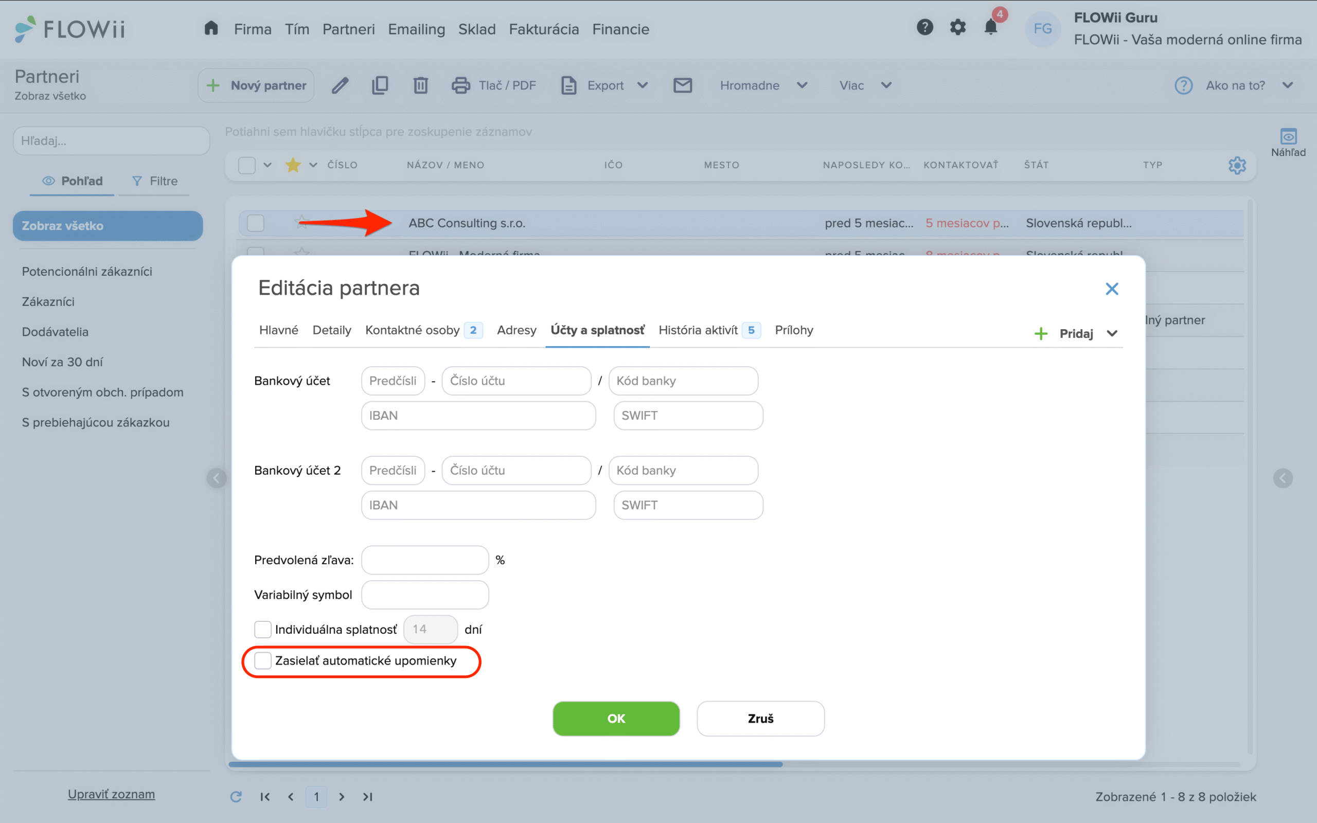 Nechcete, aby sa vybraným partnerom odosielali pripomienky a upomienky automaticky? Nastavenie nájdete priamo na karte Partnera.