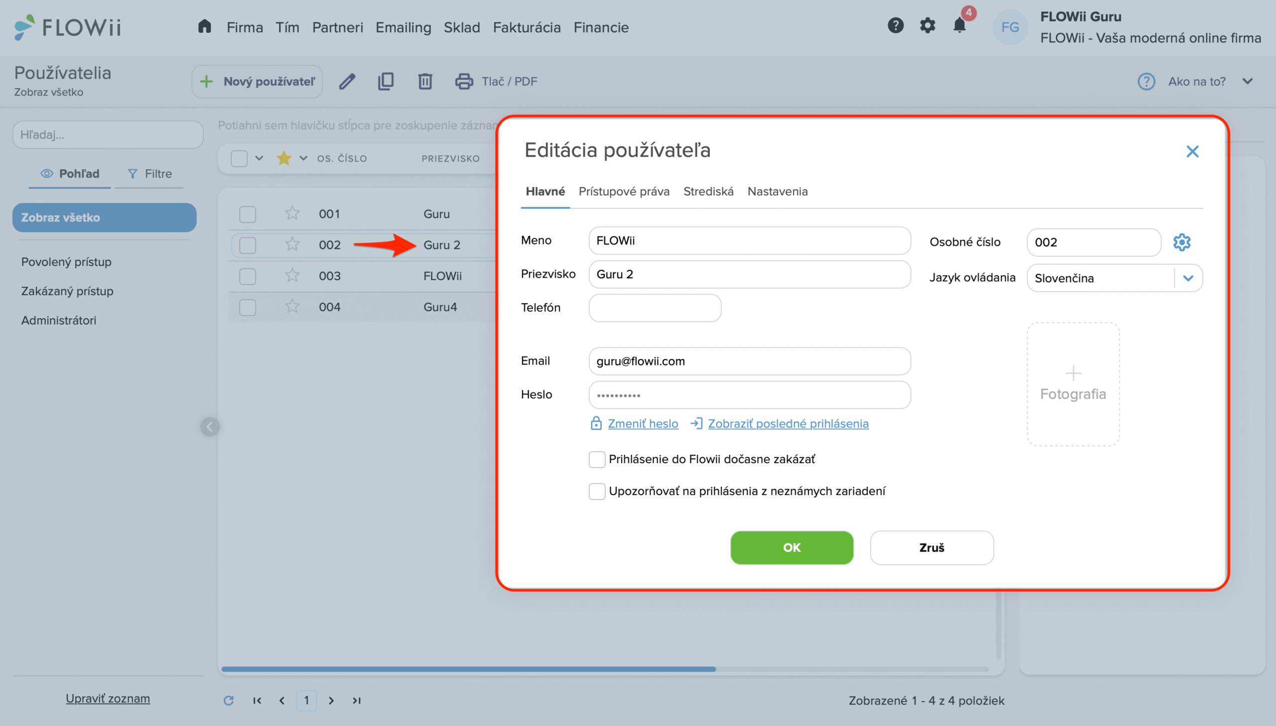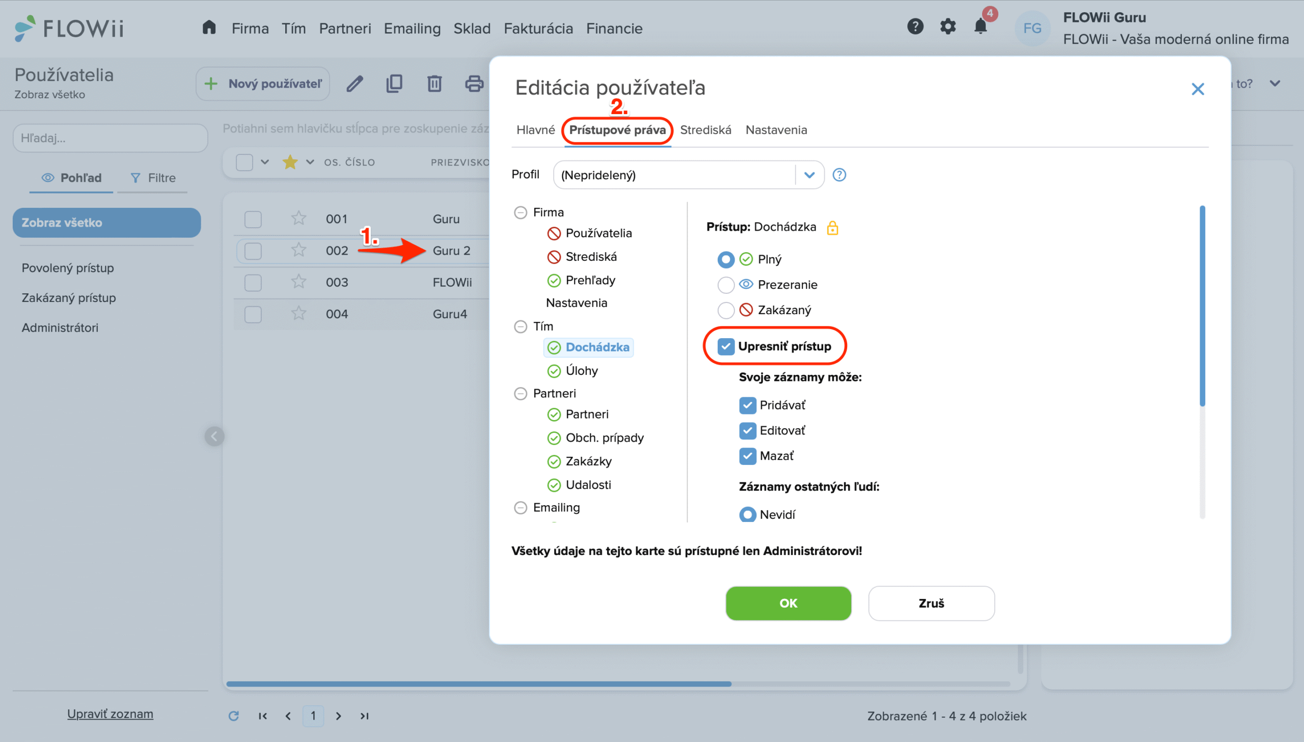 Prístupovými právami je možné zabezpečiť to, aby každý zamestnanec mal prístup len k tým informáciám a funkciám, ktoré potrebuje pre svoju prácu. Prístupové práva môže nastaviť len používateľ, ktorý je vo FLOWii zároveň aj administrátorom.