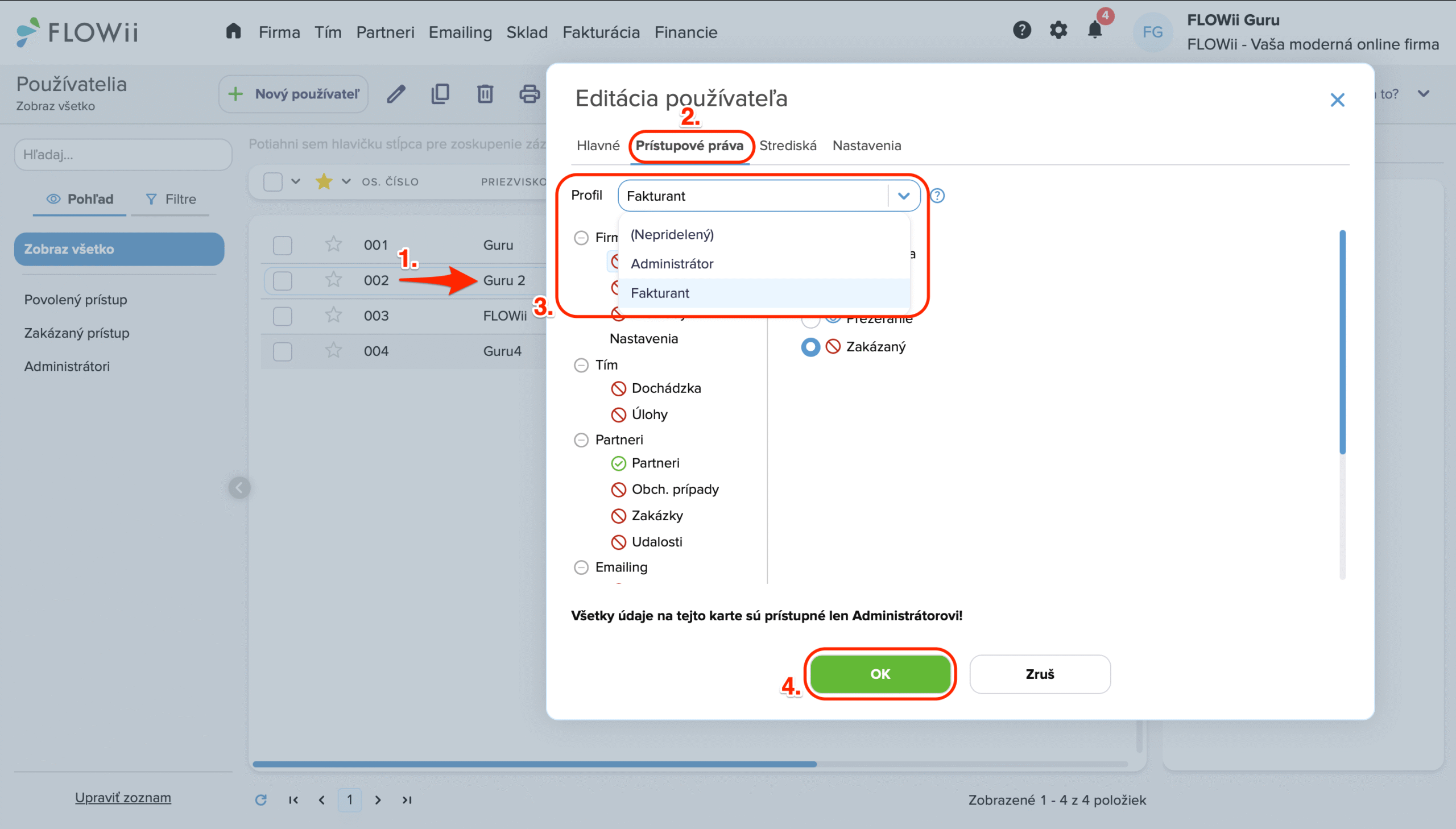 FLOWii ponúka flexibilné nastavenie prístupových práv. Môžete definovať presné oprávnenia pre každého používateľa samostatne alebo využiť praktické profily. Profil “Fakturant” napríklad môže obsahovať práva na vytváranie a upravovanie faktúr, prístup k účtovným dokumentom a k partnerom. Pri vytváraní nového zamestnanca na tejto pozícii stačí vybrať tento profil a všetky potrebné nastavenia sa automaticky aplikujú.