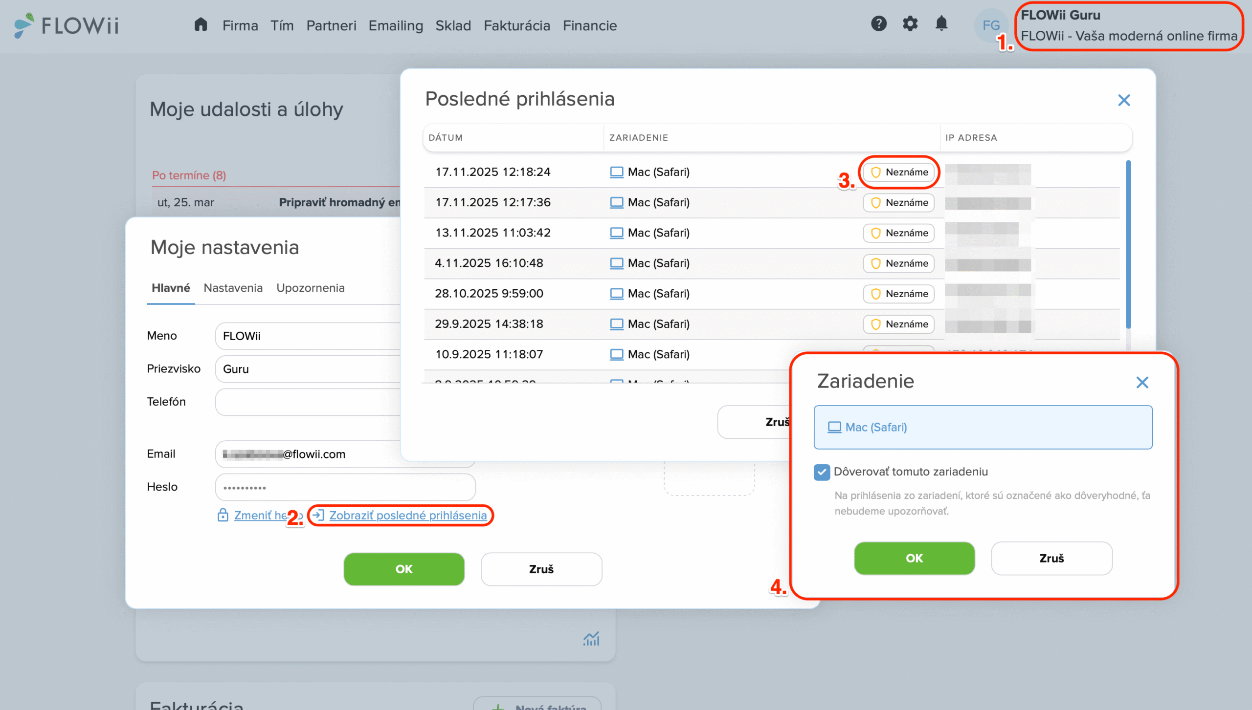 Alebo si môžete zariadenia označiť ako dôveryhodné priamo vo FLOWii. Kliknite na Moje nastavenia -> Osobné -> Zobraziť posledné prihlásenia -> označte zariadenie ako dôveryhodné.