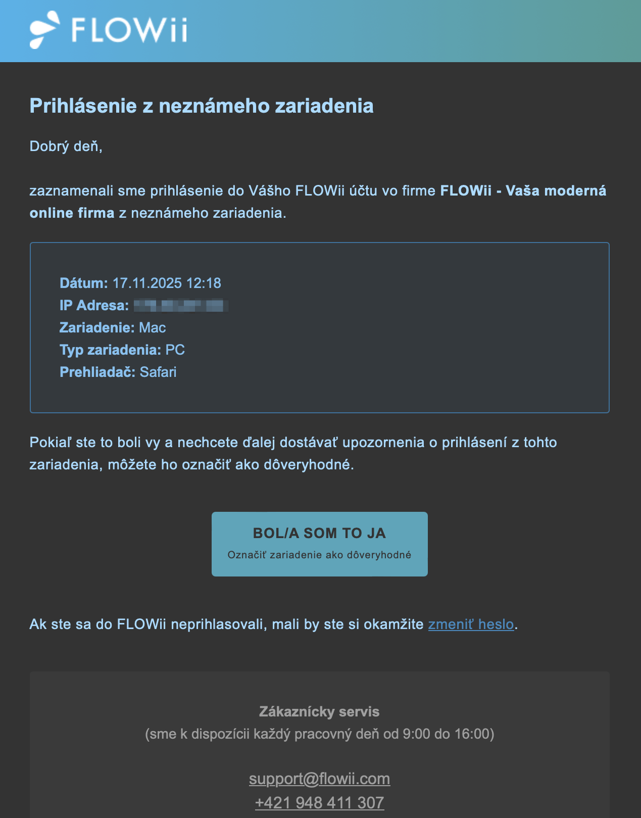 Ak ste si istý, že sa jedná o vaše prihlásenie do FLOWii, postačuje, ak si zariadenie oznáčíte ako dôveryhodné priamo preklikom do FLOWii aplikácie cez váš email.